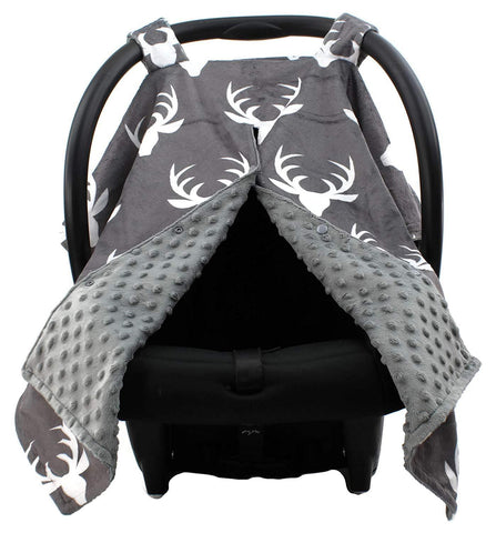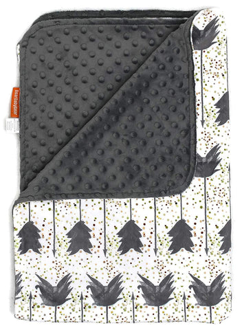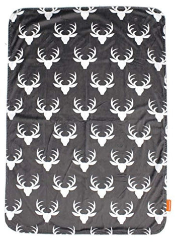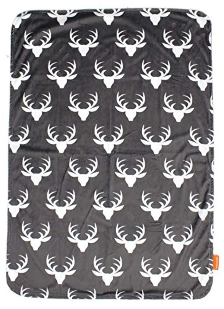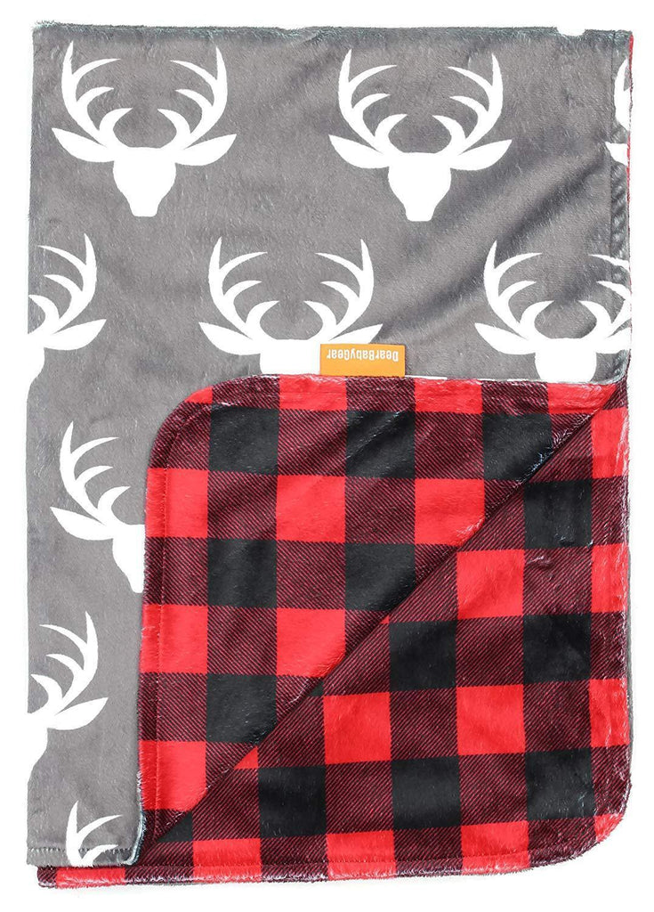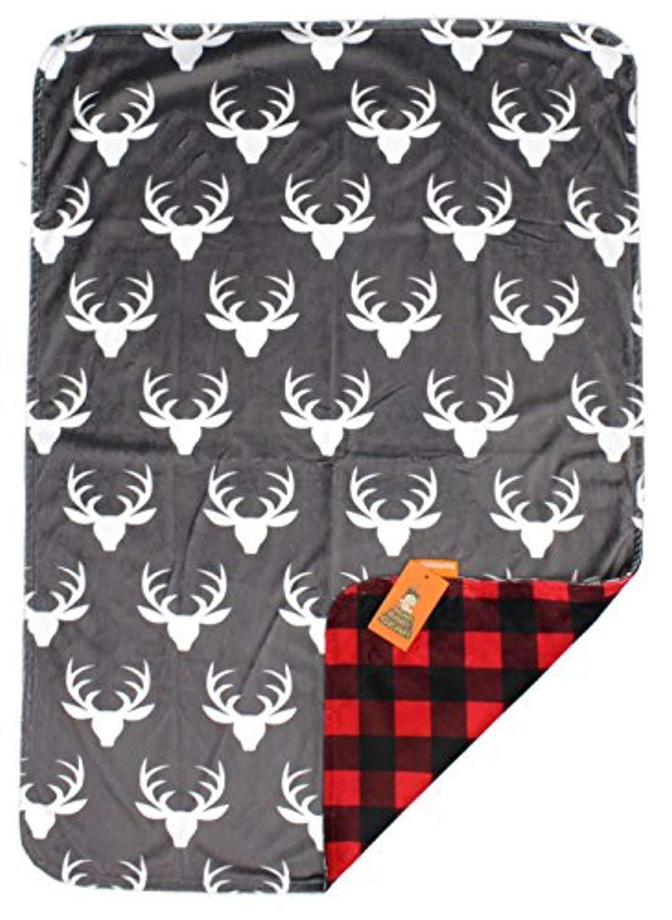 Dear Baby Gear Deluxe Custom Double Layer Baby Blankets are made with two layers of super soft long-lasting minky material. The white antler silhouette on grey smooth minky is custom printed using ecologically-safe transfer sublimation inks that provide vibrant color durability which will never fade or run when washed. Backed with a coordinating custom printed lumberjack plaid minky that is an incredibly plush ultra-soft short pile fabric allows for durability and frequent washings without shrinking, pilling or becoming matted. Minky is the ultimate fabric with a slight stretch and soft, short pile, this fabric is tailor-made for cuddling, favored for baby blankets and accessories.