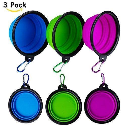 Three Pack Set: Package includes three pieces of pet travel bowl, three metal carabiners. Colors are purple, green and blue, dry 100% and no moldy smell. More sanitary. A clean pet bowl every day for your dog