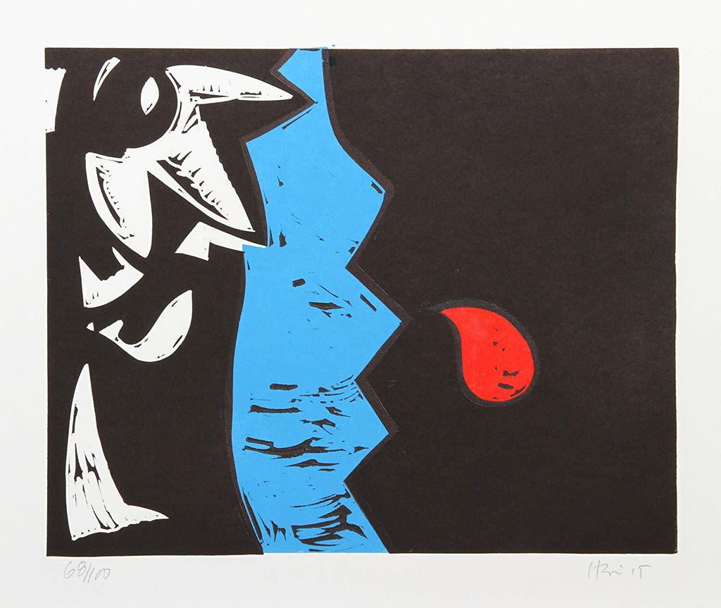 Woodblock by the American artist Charlie Hewitt, circa 1995, is a fine example of geometric abstraction. The bright red and blue create a vivid contrast to the subtle black background. Signed and numbered.