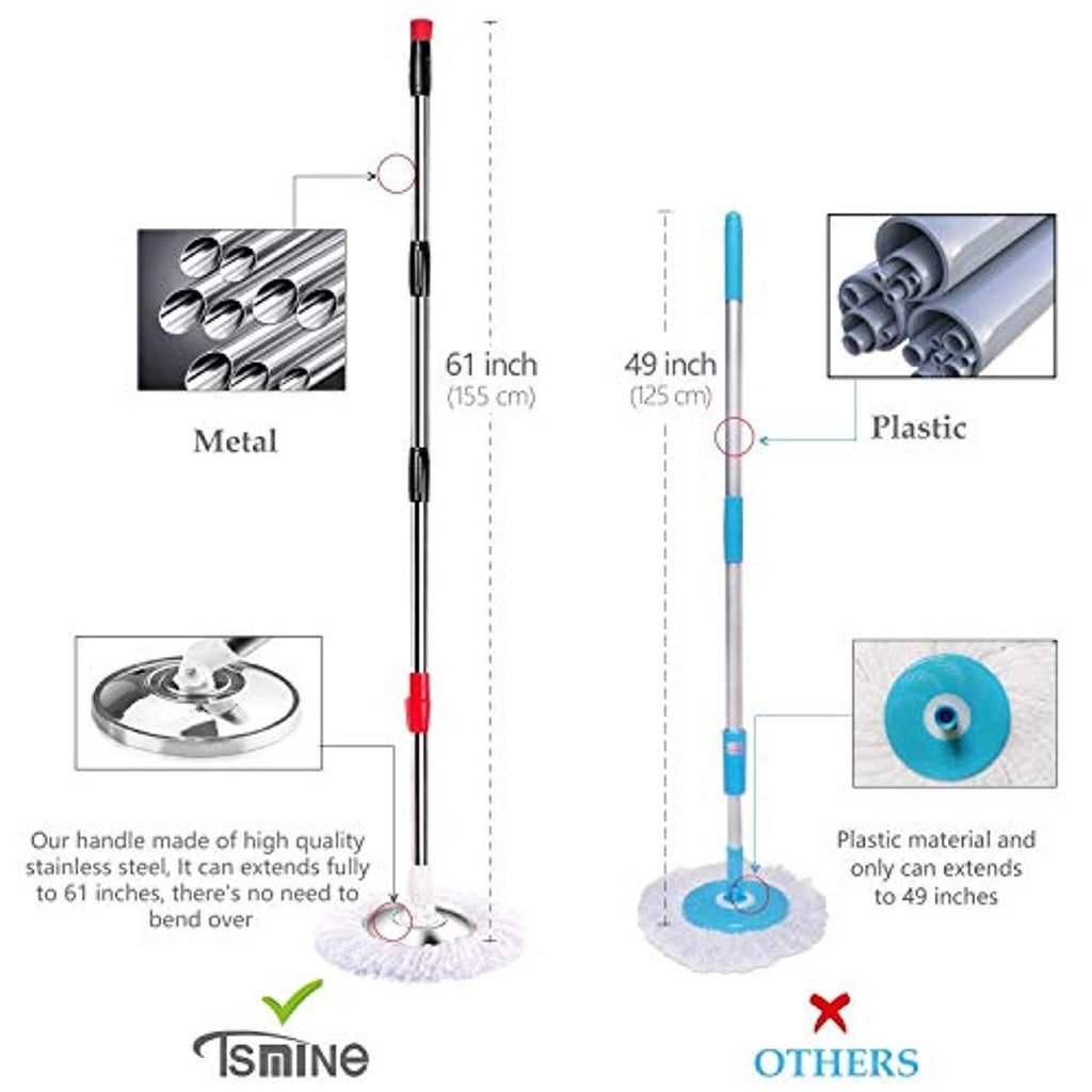 đăQUALITY MATERIALă - Unlike others, Basket, wringer, pallet and handle of our spin mop bucket are made of durable 304 stainless steel and PP. Upgraded handle allows the mop head to wing drier and make less noise. The telescoping handle adjusts up to 61 inch, so you donât have to bend down and suffer from back pain