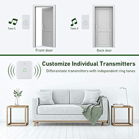 TAILOR YOUR TRANSMITTER: 40 mm stereo speaker delivers rich and crisp sound; 52 melodies and 5 adjustable volume levels with a maximum setting of 115 dB; set a different ring tone for each transmitter so that you know exactly which doorbell has been rung