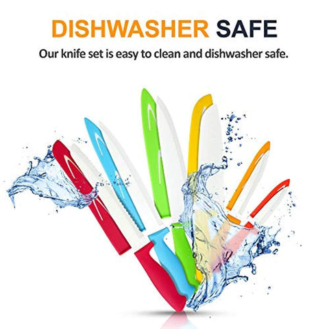 ✅ THIS SET IS GORGEOUS - The vibrant colors of our Multicolor Knife Set with the crispness of the sleek white blades, will look absolutely STUNNING in your kitchen. SIZES: Our knife set includes 6 KNIVES and 6 PROTECTIVE COVERS meant to ensure that your knives are stored away safely. The set includes: 8" Chef Knife, 8" bread knife, 8" slicer knife, 7" santoku knife, 5" utility knife, and 3.5" paring knife.