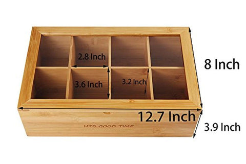 Bamboo Tea Bag Container, “GOOD TIME” Engraved Tea Box Organizer, Tea Bag Chest With Transparent Lid, 8 Compartments organizers and storage With Magnetic Closure By HTB
