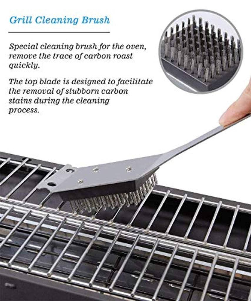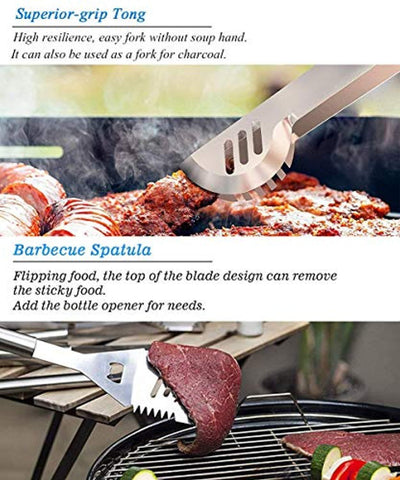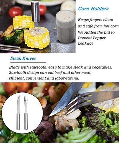 - A COMPLETE KIT-Swiss knife spatula,power tongs,basting brush,cleaning brush,corn holders and skewers