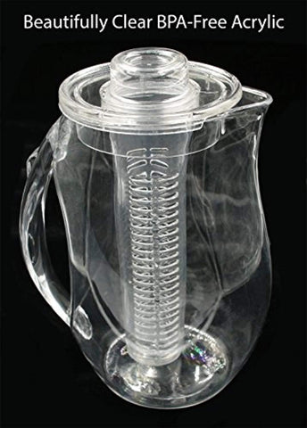 BEAUTIFUL CRYSTAL CLEAR BPA-FREE ACRYLIC PITCHER. Includes removable hollow, fruit core that could be filled with fruit, vegetables and herbs. The hollow rod has open slots which allow the flavors to infuse with water. Includes free ice core so you can cool your favorite drinks without diluting the flavors.