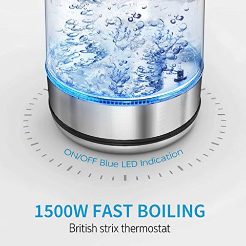 FAST BOILING AND LARGE CAPACITY - When you need a quick cup, choose this kettle. 1500W power allows the water to boil in 6-8 mins., faster than microwave and stovetop. 1.7L capacity can provide 6-7 cups of tea, especially suitable for entertaining guests and friends. The blue LED indicator can let you know when kettle starts to boil or shut off.