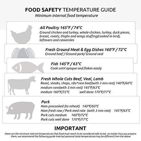 【TEMPERATURE RANGE】Cooking Thermometer with temperature range of -58°F ~ 572°F (-50°C ~ 300°C), accurate to ±0.9°F; Celsius/Fahrenheit switchable; Perfect for indoor outdoor cooking, grilling, BBQ and so on; NEVER use the thermometer in a closed oven!!
