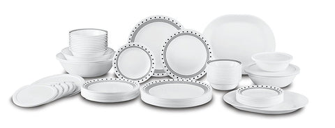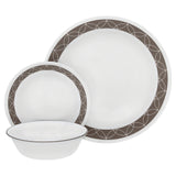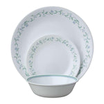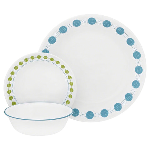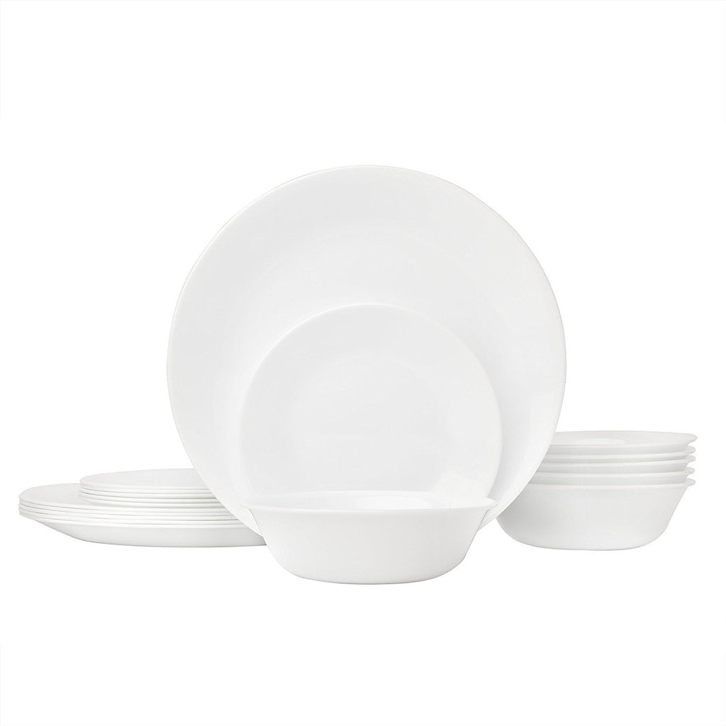 All pieces are made of Corelle triple-layer strong glass, which is break and chip resistant, lightweight, and easily stackable for space saving