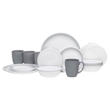 Winter Frost White set includes 20 pieces total, including four (4) sets of each: 10-1/4-inch dinner plates, 6-3/4-inch bread plates, 18-ounce soup/cereal bowls with BPA-free storage lids, and 11-ounce stoneware mugs