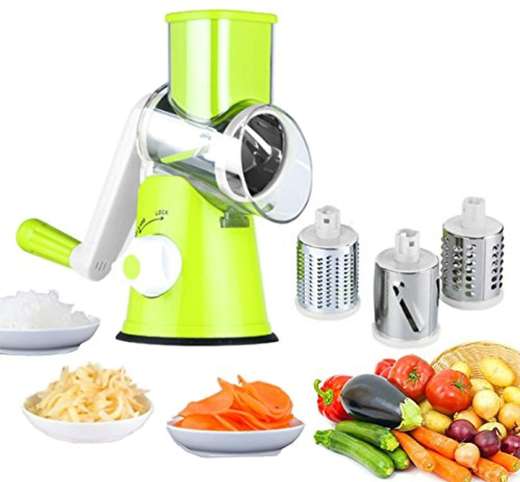 Edofiy E-KW-D020 Manual Speedy Rotared Vegetable Fruit Cheese Nut Slicer Cutter Shredder Grinder with 3 Interchangeable Round Stainless Steel Blades, Large, Green