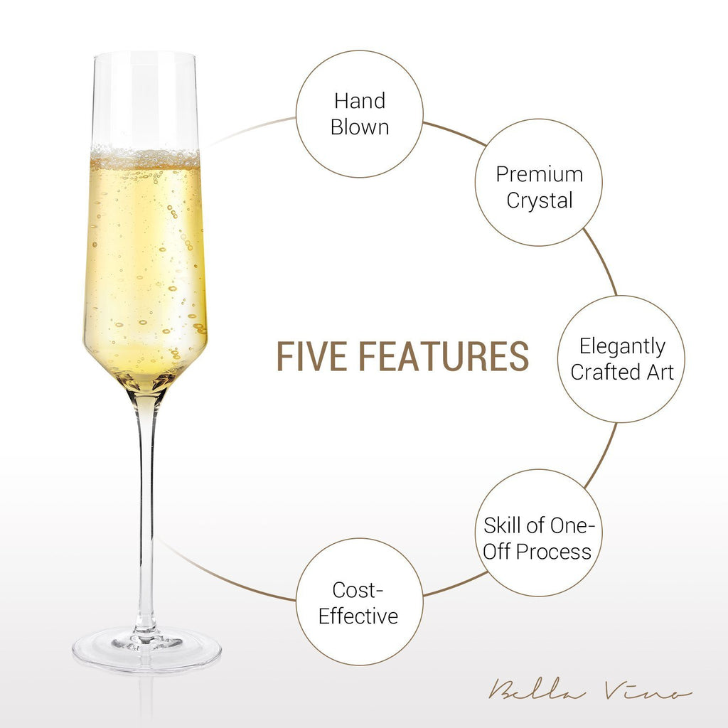 PREMIUM CLEAR CRYSTAL: Bella Vino champagne flutes are made from lightweight yet durable lead-free crystal glass so you can see and taste your wine (not the glass). Scratch-resistant quality that will last for years. Hand washing recommended