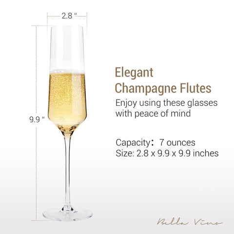 Hand Blown Crystal Champagne Flutes - Bella Vino Elegant Champagne Glasses Made from 100% Lead Free Premium Crystal Glass,Perfect for Any Occasion,Great Gift, 10", 7 Oz, Set of 2, Clear
