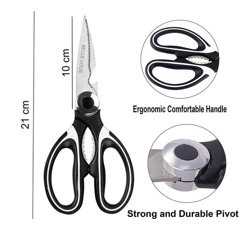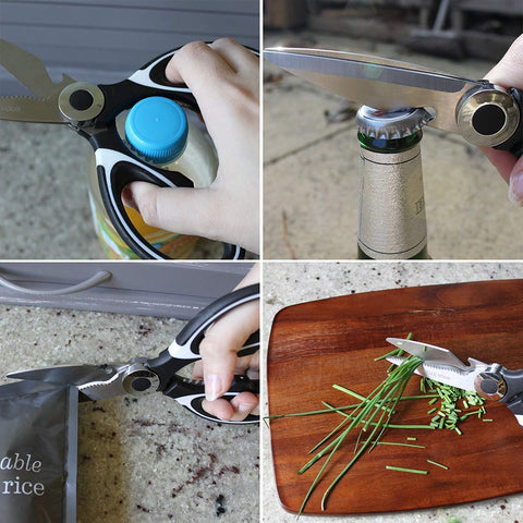 MULTI USE: Cut your meat, poultry, vegetables, herbs, chicken, seas foods or food packaging’s with ease! You can open all type of bottles and even crack nuts with center toothed blades!
