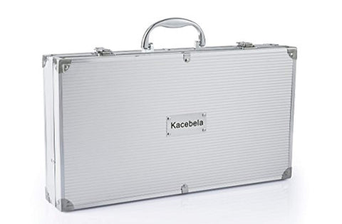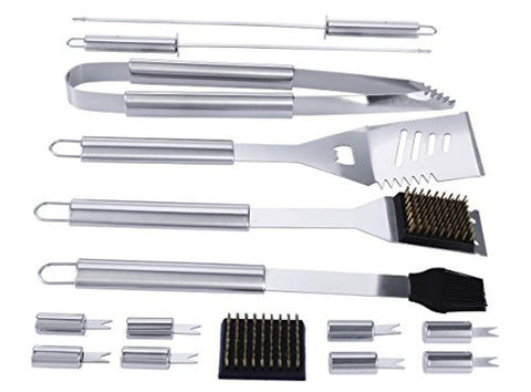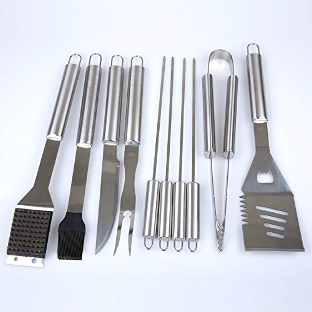 Barbecue tool includes chef's spatula, fork, knife, grill tong, 8 corn holders, 4 skewers, silicone basting brush, cleaning brush, replacement brush head, aluminum storage case Durable stainless-steel tool construction, food safety grade, dishwasher safe, resists heat and rust and won't crack after extended use Elongated handles, convenient handle rings for hanging Includes aluminum storage case, perfect for the on-the-go griller