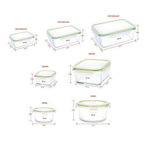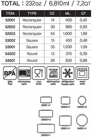 Rectangular: 14 ounce, (2)30 ounce, 54 ounce; Square: 15 ounce, 35 ounce; Round: (2)13 ounce, 28 ounce Refrigerator, oven (without the lid), freezer, microwave and dishwasher safe (top shelf recommended for the lid) One year limited manufacturer warranty