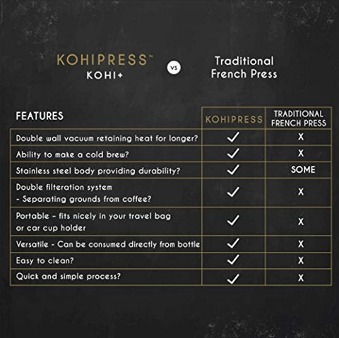 KOHIPRESS The Original Portable French Press Coffee Maker | Vacuum Insulated Travel Mug | Premium Stainless Steel | Hot and Cold Brew (12 oz) | Great for Commuter, Camping, Outdoors and Office (Black)ALL-IN-ONE brewer and insulated travel mug - The versatile KOHIPRESS uses a full immersion steep with a pressurized plunger press ( a similar method as the Aerobie Aeropress ) to make a rich, smooth cup of coffee.