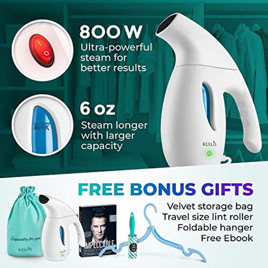 • ๐Ÿ‘”๐Ÿ‘— A STEAMER FOR CLOTHES THAT IS WORTH HAVING - Between business meetings and dinner dates, you donโ€™t have time to change clothes. Use KULLISโ€™ handheld mini travel fabric garment steamer for an instant refresh. Compact, lightweight, and travel friendly, yet powerful enough to beat any wrinkle in record time! Unlike other portable wrinkle remover garment steamers, its large 6oz capacity heats up in 60 seconds, giving you 10-12 minutes of steady steam to refresh any fabric.