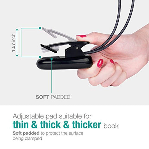 LATEST SMD LED TECHNOLOGY- Most suitable LED for eyes reading lights. Light up 3x broader area evenly than normal LED. Flicker-free and glare-free, 100000 hours life. 12 LEDs are the max number for such a compact clip on reading light, much broader and brighter than other 4 or 8 LEDs book lights. Dual independent heads light up 2 full pages of your any size books, novels, orchestra, A4 size magazines, and larger pages.