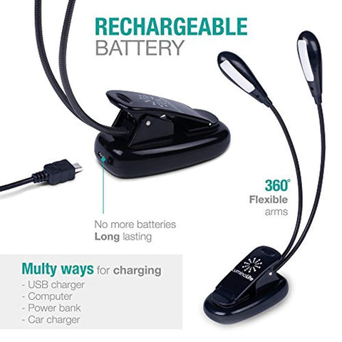 LuminoLite Rechargeable 12 LED Eye-Care Warm Book Light, Clip On Bed Reading Light, Music Stand Lamp, 2 Brightness. Perfect for Bookworms, Kids & Music Players.USB Cable Included.