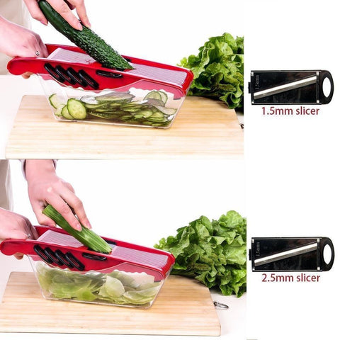 • Package included: 1 x Vegetable Chopper in size 31.5cm x 10cm x 9cm. 1 x 3.5mm/ 2.0mm/ 1.5mm/ 1.0mm slicer, 1 x wavy slicer, and 1 x grater, 1 x peeled knife, 1 x Safety Protector. Please be assured. All the vegetable chopper parts are made of high quality Eco-friendly material, bring you the safe and healthy promise. Meet your daily needs.