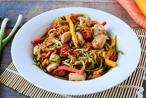 • ALL-INCLUSIVE FOOD CUTTER, LOADED WITH CONVENIENT PARTS AND FEATURES – The spiral vegetable slicer comes loaded with accessories like a large Catch & Store Container, recipe booklet, user guide, online recipe app with videos, 2X blade storage caddy’s, and cleaning brush. We made it easy for you to whip up healthy, low carb, Paleo friendly meals and keto noodles.