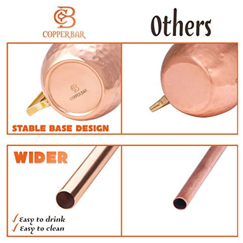 SPECIAL EXTRAS & BONUS - We provide: 2 copper straws + 1 shot glass + 1 stirrer + 2 E-books. We have a gorgeous brass handle for your thumbs comfort, and we have created a fantastic stable base for your mug. Our copper mugs feature round shaped edges especially for your convenience, with none of those sharp edges like in other mugs. If that's not enough - our straws are exclusively made wider than our competitors' so they are extra easy to drink from and clean.