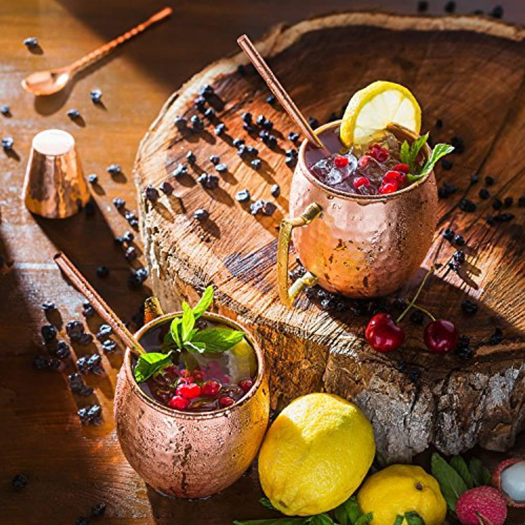 Moscow Mule Mugs 100% Solid Copper, FOOD SAFE, Gift Set of 2, 16oz, Hammered, No Nickel, BONUS: 2 Straws + 1 Shot Glass + Stirrer & 2 E-Books by Copper-Bar