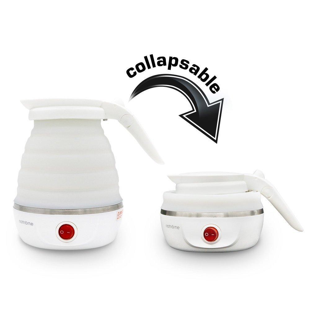 Nathome Travel Foldable Electric Kettle - Fast Water Boiling - Food Grade Silicone - Small, Collapsible, Portable - Boil Dry Protection - .6 Qt - 100/120v - 850W US Plug- White