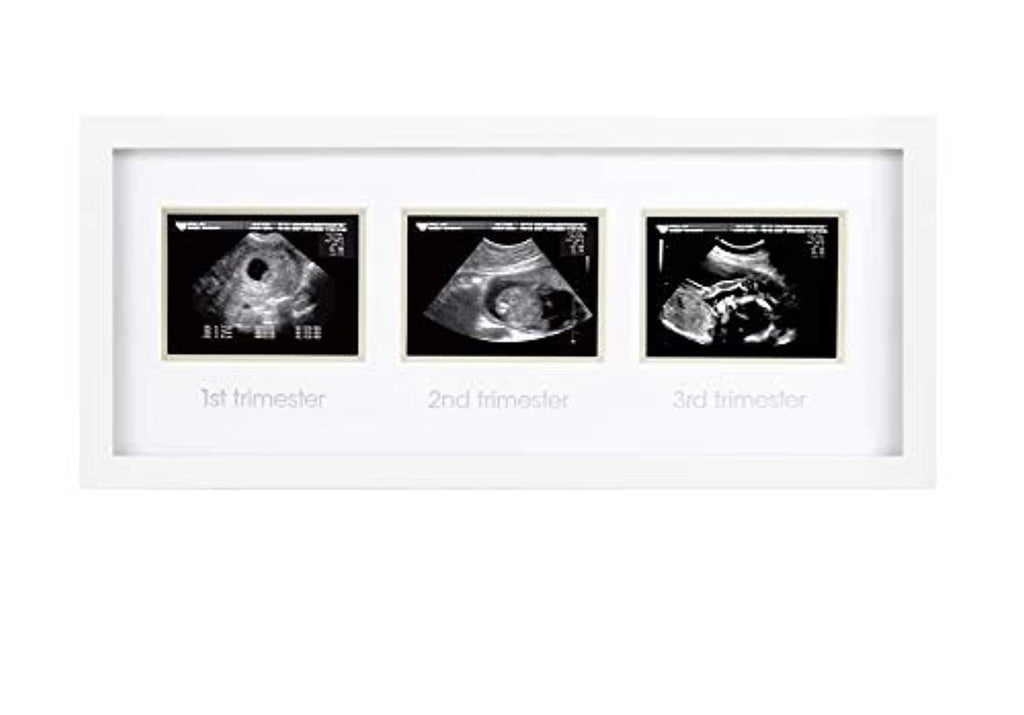 "Cherish every trimester of your pregnancy with Pearhead’s keepsake trimester sonogram photo frame. This solid white, wooden photo frame is the perfect keepsake for decorating your home or baby’s nursery. At every check-up, have fun getting your sonogram printed to then place inside your frame. The 3 photo inserts can hold a 3” x 4” sonogram photo on your adorable bundle of joy. Once the frame is filled up and baby has almost arrived, display in your home with the included easel or sawtooth hanger. The crisp white frame will make an excellent nursery decoration for any baby boy nursery or baby girl room. The white beveled mat included is decorated in a silver foil stamp with “1st trimester,” “2nd trimester,” and “3rd trimester.” The frame also includes a silver background mat to add an extra decorative touch. It’s the perfect gift for anyone expecting a baby. Keepsake frame comes in beautiful gift box packaging, any expecting parent will be happy to open this special photo frame. And don’t forget to add it to your registry! You’ll love opening this frame up at your baby shower to celebrate your pregnancy journey. Cherish every stage of your pregnancy with Pearhead’s sonogram trimester frame. Product dimensions: 17” W x 7.5” H x .63” D; Photo inserts: 3” x 4”