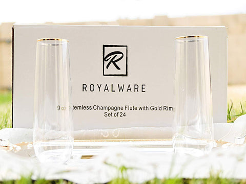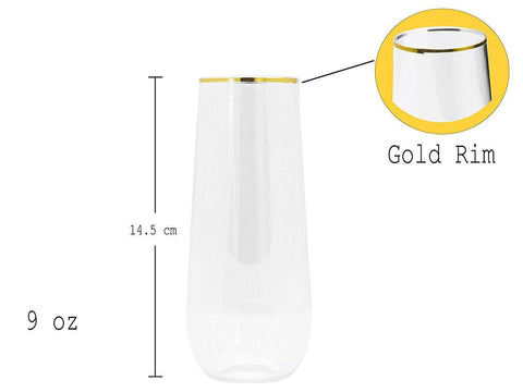 Plastic Champagne Flutes with GOLD RIM SET OF 24 | 9 Oz STEMLESS | Disposable | BPA-FREE | Shatterproof | Clear Toasting Glasses | Recyclable | Perfect for Weddings Party Events Holidays