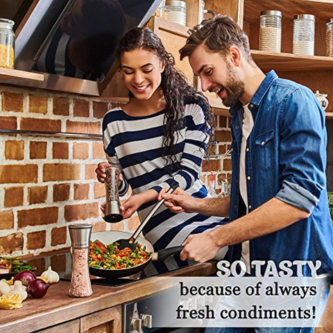 ✅ LOOKS SIMPLY STUNNING: The beautiful clash of glass and stainless steel gives this grinder set an elegance that will spruce up your kitchen and thoroughly impress guests at the dinner table. It makes the perfect holiday or anniversary kitchen gift.