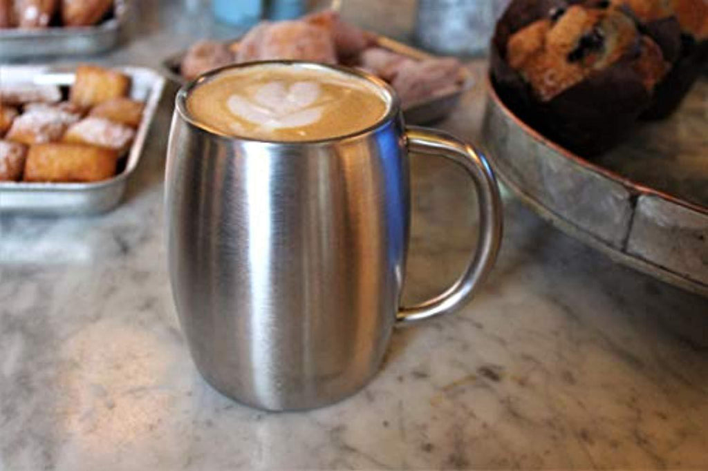 • COMFORTABLE AND ELEGANT - The metal mugs have an attractive curved shape that is pleasing to the eyes. A welded ergonomic handle stays securely attached and allows users to fit 4 fingers comfortably. The mug has a flat, stable bottom that sits flush on counter and table tops.