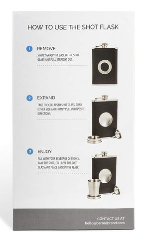 SHOT FLASK! - The Shot Flask makes drinking on the go easy. Take the the shot glass from the side of the shot flask and pour your drink! After you're finished, collapse the shot glass and put it right back on the side of the flask.