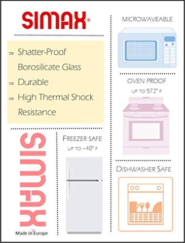 • BOROSILICATE VS. SODA-LIME GLASS: Soda-lime glass, used by many of today’s most popular glass cookware manufactures, works great to prevent breakage from mechanical stress. But unlike Borosilicate glass, it is not so great for thermal shock resistance and withstanding extreme temperature changes. That’s why Simax products are made from genuine, laboratory-grade Borosilicate glass, so you can cook and store your food without worrying about exploding dishes.