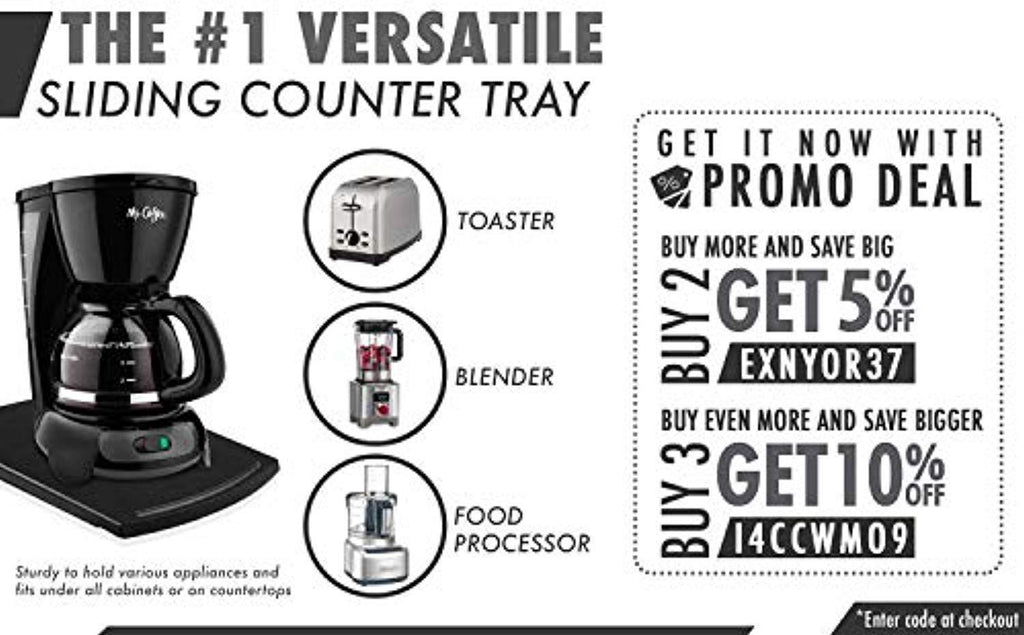 • THE #1 VERSATILE SLIDING COUNTER TRAY - Whatever it is - Keurig coffee makers, Cuisinart, Hamilton, Kitchenaid, Vitamix blenders, food processors - our 12 inch coffee machine sliding tray is guaranteed to ease up your burdens by holding out all types of kitchen appliances from light to heavy ones up to about 25 lbs. This counter top rolling tray will do its job without trouble, fitting nicely under your kitchen cabinets and on countertops!