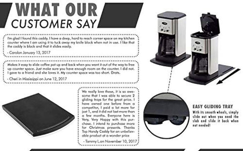 • WHAT OUR CUSTOMERS SAY - With over 240+ 5-star reviews, here is what our beloved customers say, “What's not to love”, “After done brewing, with the handy caddy, it is a simple glide back into place”, “I like that the caddy is black and that it slides easily”, “This works so great with my Keurig coffee maker”, and “Great price, fast shipping, just what I was looking for”.