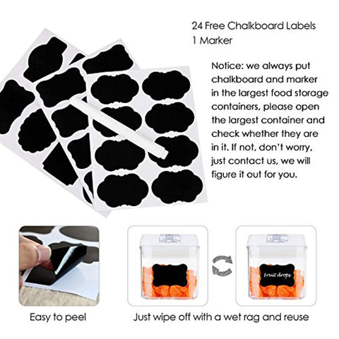 24 Free Chalkboard Labels and 1 Marker----Except 7 cereal storage containers, you will also receive 24 pieces labels and 1 marker, which will help you never confuse flour with powdered sugar or baking powder with baking soda. They are reusable, you can switch contents whenever you need. Just wipe clean with a damp cloth to change what you have written, Peel and Re-stick.