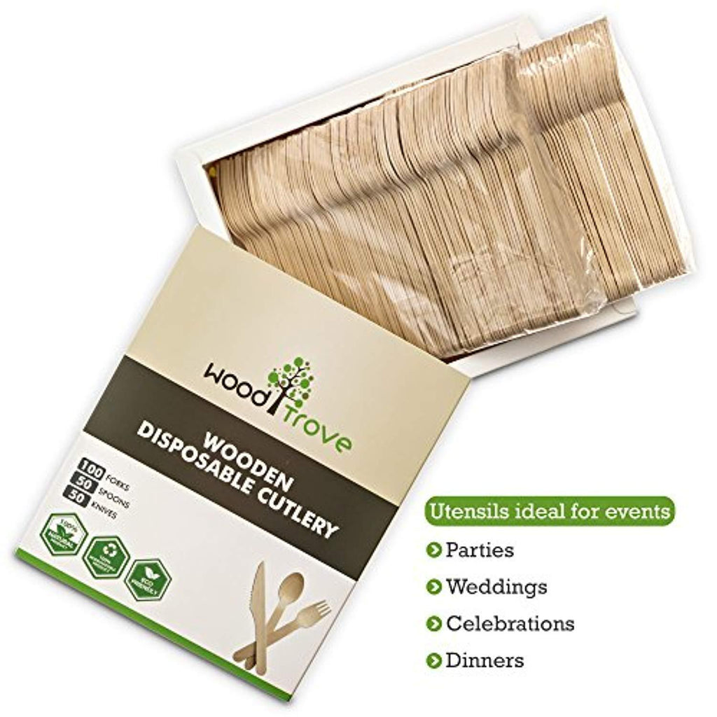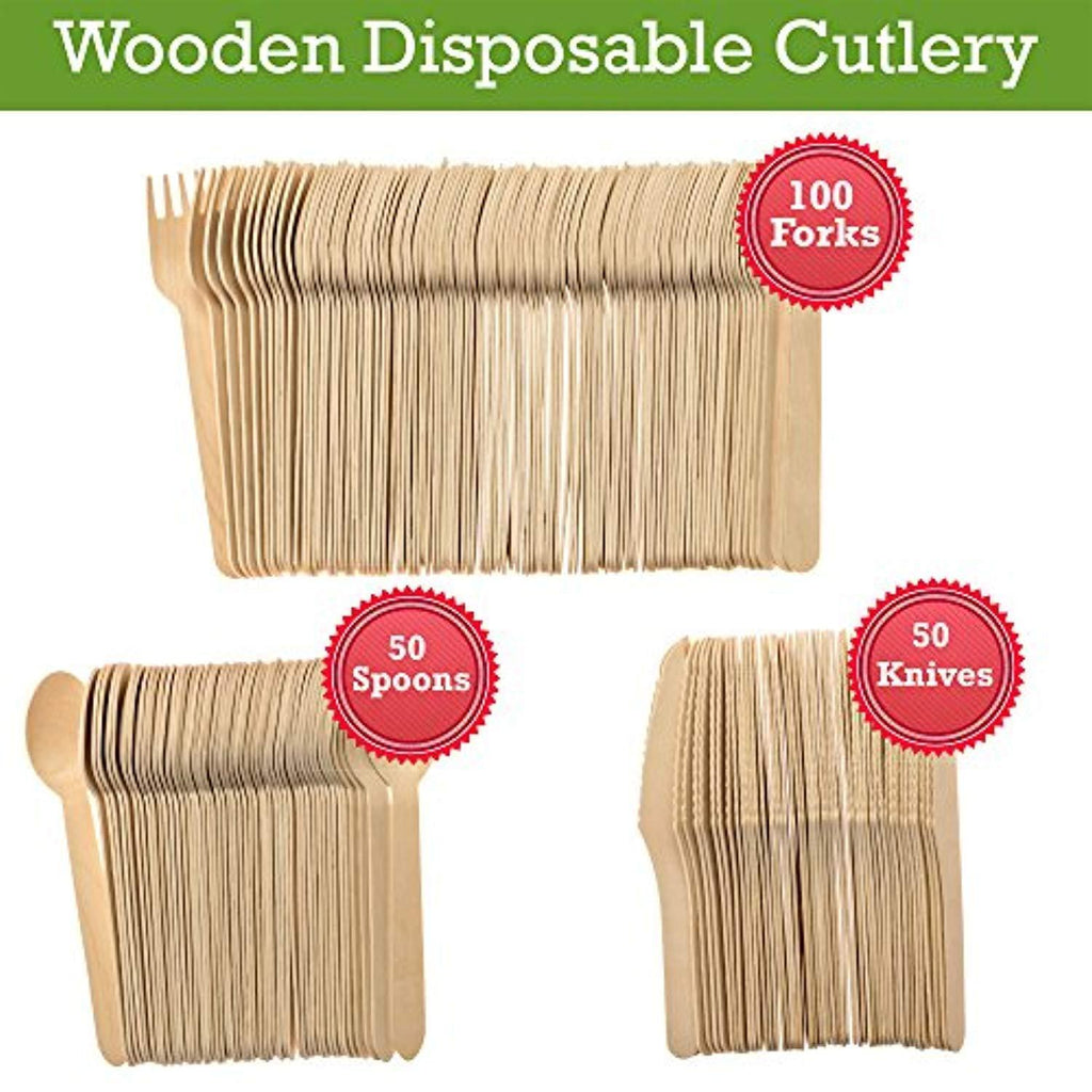 Wooden Disposable Utensils Set 100 Forks 50 Spoons 50 Knives Wood Cutlery Eco Friendly Compostable Biodegradable Silverware Party Flatware Kitchen Serving Eating...