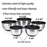 SOLID QUALITY: Made of high-quality Stainless Steel and BPA-free silicone, the Mixing Bowls come with anti-Slip bottom and measurement marks inside.They are rust-resistant, deform-resistant, anti-aging, long lasting durability, non-stick bottom and easy-open lid.
