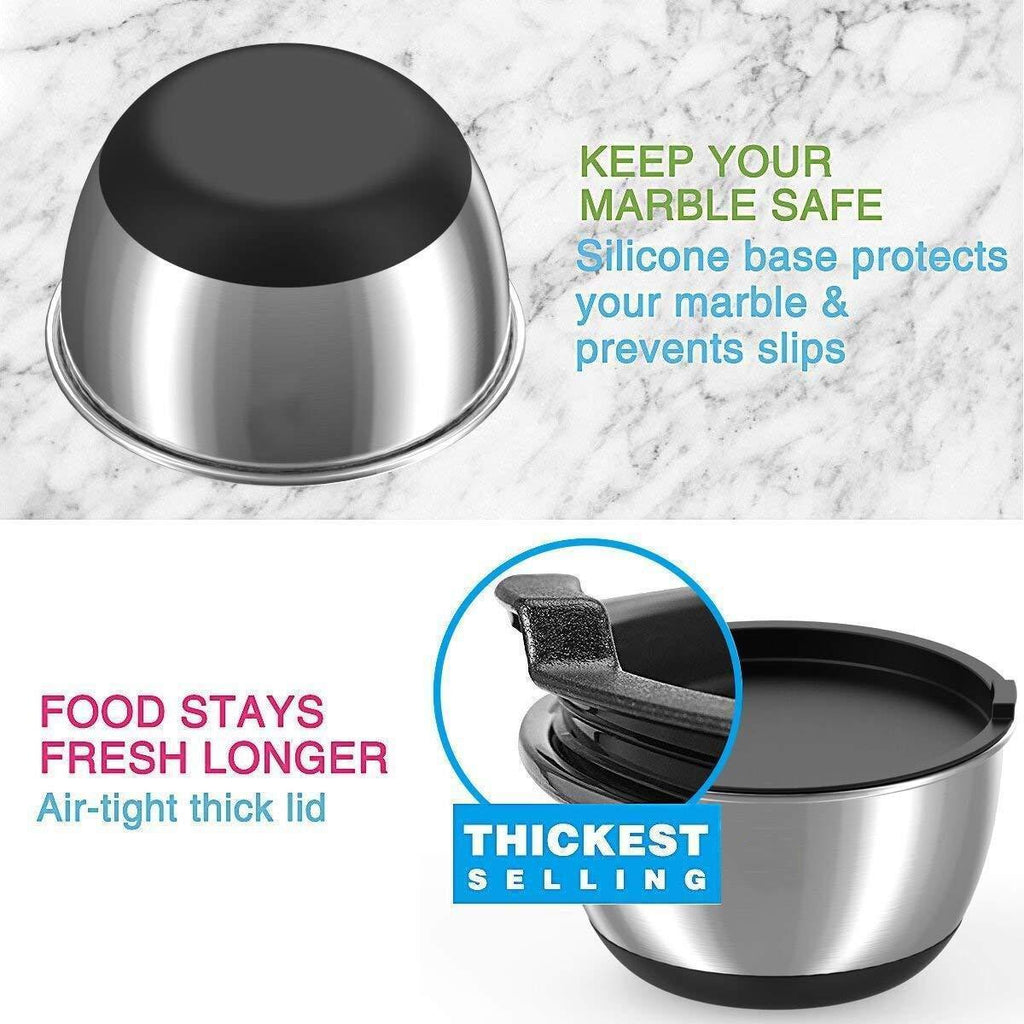 BPA free lids keep your recipes fresh in the refrigerator,when marinating, or when you need serving bowls that keep food warm;a deepening basin type is ideal for mixing ingredients without any splash; non-skid silicone bottoms would prevent slippage during prep.