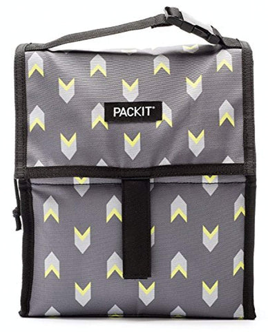 PackIt 10 inch 10 hour Freezable Foldable Reusable Multipal Uses Lunch Bag with Adjustable Strap (Grey Neon Arrows)