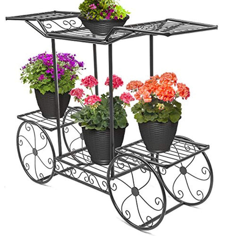 • GARDEN CART & PLANT HOLDER STAND (BLACK) — Beautifully display plants, flowers, and garden decorations on a multi-level planter stand— Perfect for home and garden lovers
