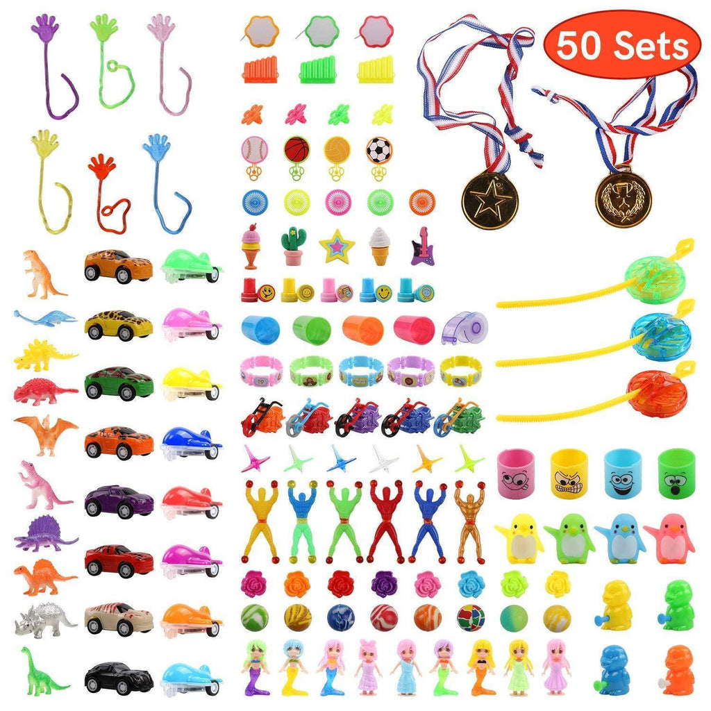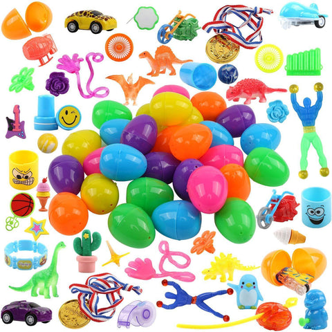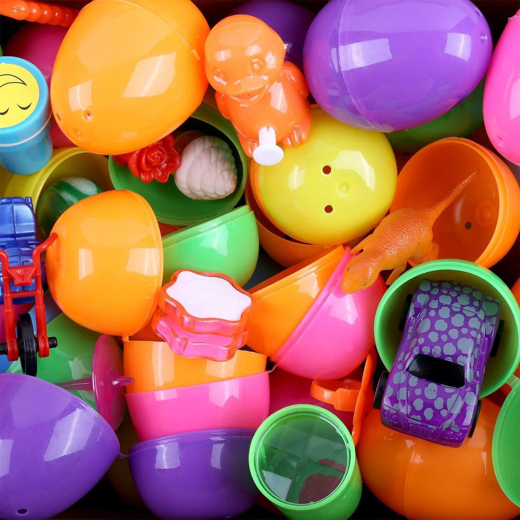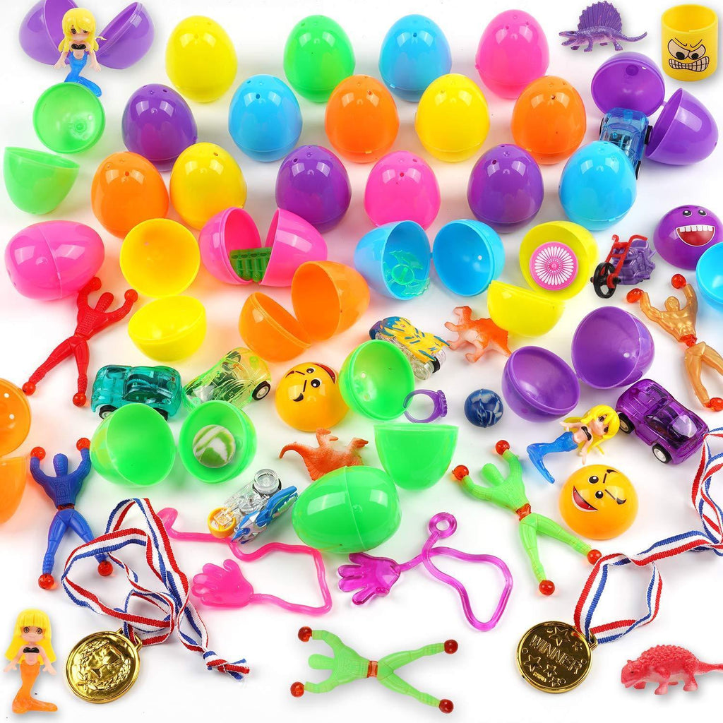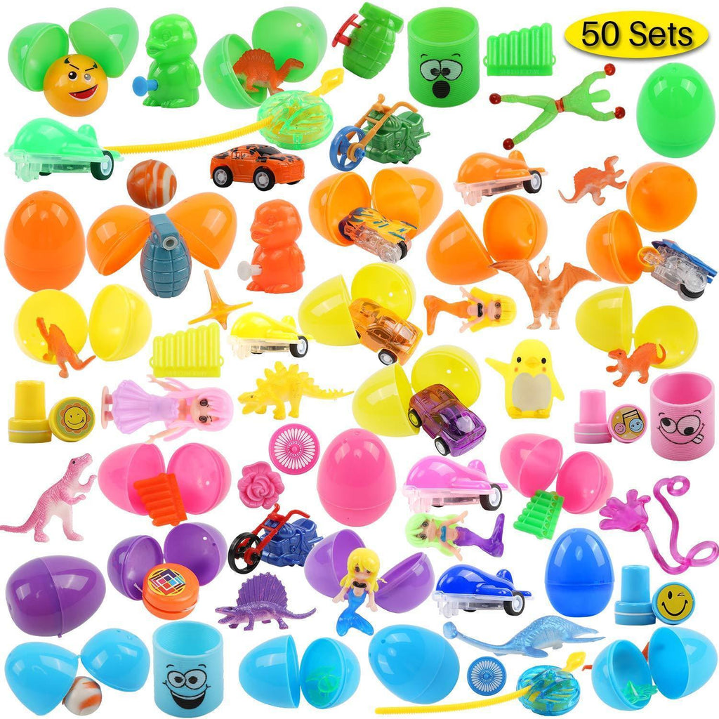 FUNNISM 50 Pieces Toys Filled Surprise Eggs, 2.5 Inches Bright Colorful Prefilled Plastic Surprise Eggs with 25 kinds of Popular Toys