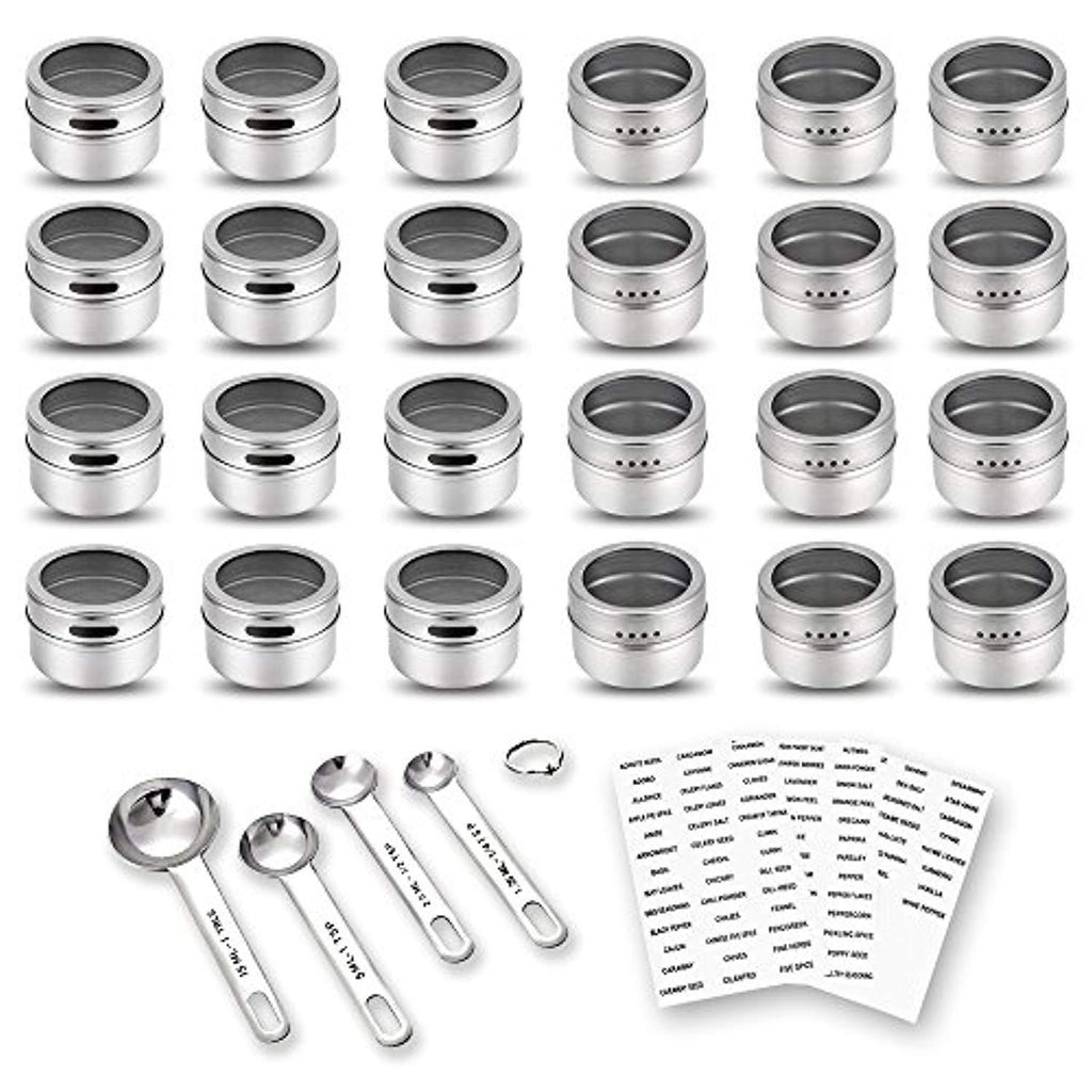 24 Magnetic Spice Tins, 117 PVC Spice Labels, 4 Stainless Steel Measuring Spoons and Recipes E-book by Sanquility. Round Storage Spice Jars Set of 24, Clear Top Lid with Sift or Pour