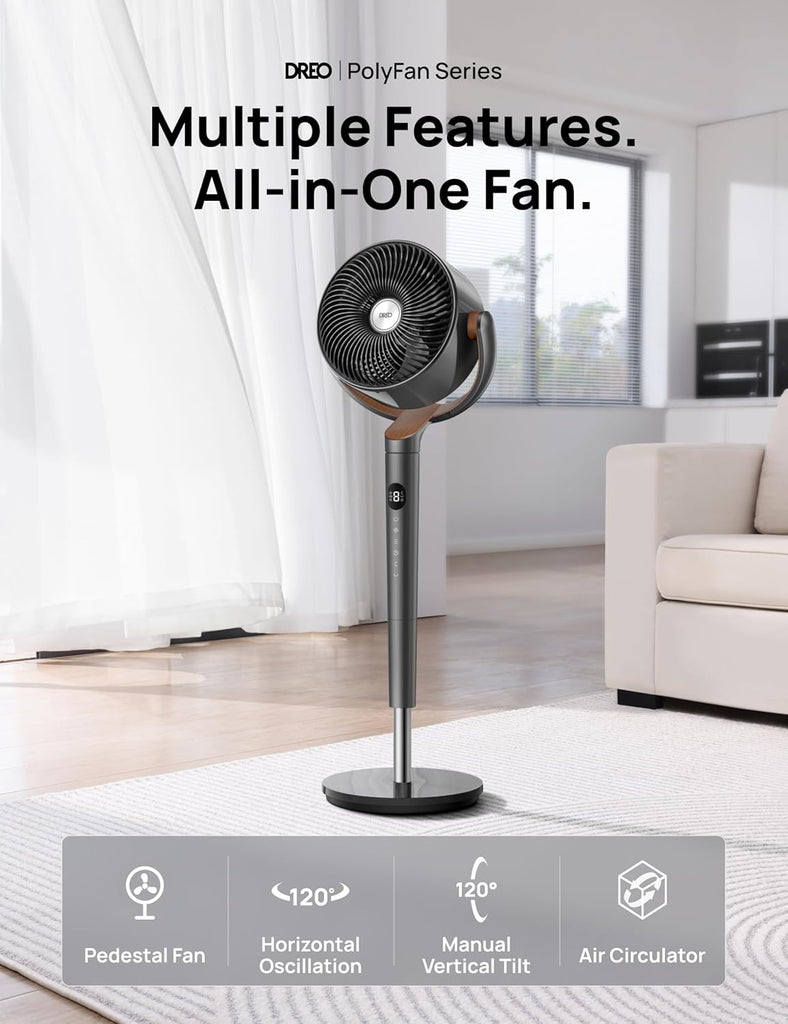 - 𝑶𝒏𝒆 𝑭𝒂𝒏, 𝑴𝒖𝒍𝒕𝒊𝒑𝒍𝒆 𝑭𝒖𝒏𝒄𝒕𝒊𝒐𝒏𝒔: From circulating air around, to quiet powerful cooling, Dreo PolyFan for bedroom combines a pedestal fan, an oscillating fan, and an air circulator into one, which adapts greatly to all your needs. Don't get confused by its shape, the 8 wind speeds and 3 modes of the Dreo standing fan do much more than a fan. (13.07"D x 7.28"W x 39.29"H)