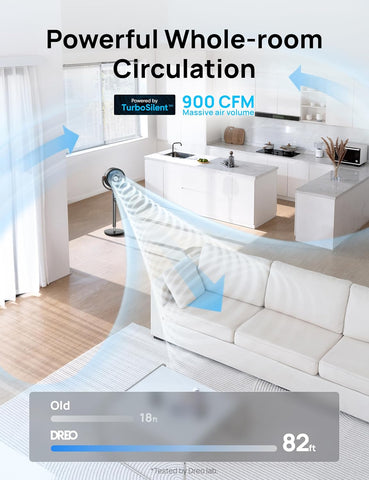 - 𝑼𝒍𝒕𝒓𝒂 𝑸𝒖𝒊𝒆𝒕 𝑫𝑪 𝑴𝒐𝒕𝒐𝒓: Don't sacrifice performance for quietness, it reduces noise down to 20dB, making it the ideal quiet fan for bedtime or working without distractions. Thanks to the DREO brushless DC motor combined with turbine style blade technology, it circulates the air quickly throughout the room. And the DC motor produces 30% more air using 40% less energy.