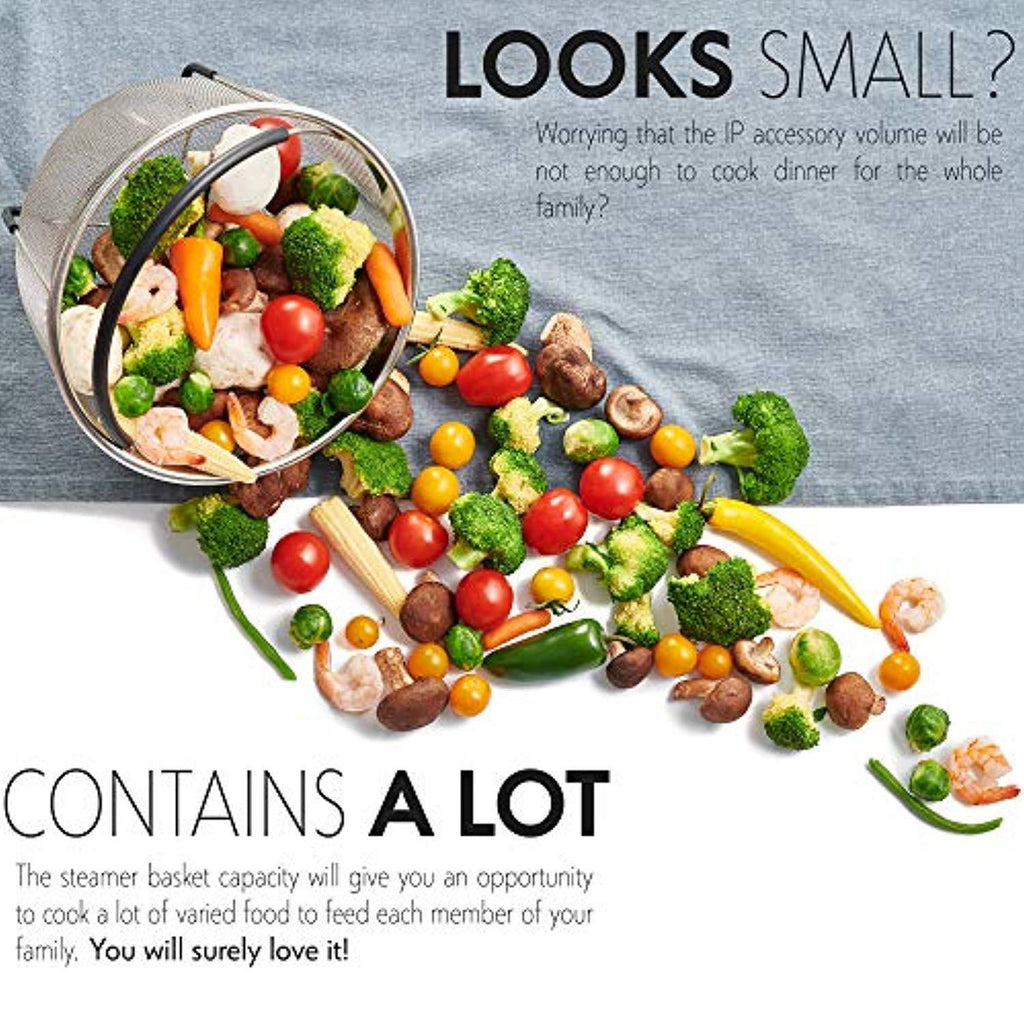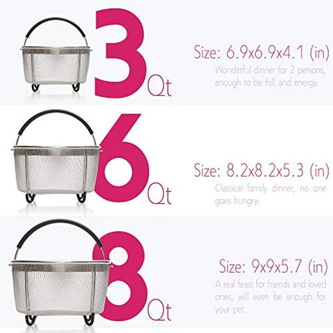 FITS IN ALL INSTANT POT MODELS: The kitchen gadget comes in 3qt, 6qt or 8quart size. Suitable for the IP-DUO60, Plus60, DUO80, ULTRA, IP Mini IP Bluetooth, LUX60 V3, Cosori, Crock Pot or the Power Pressure Cooker XL. And unlike other steamer baskets - there’s no need to break off the handles to get it to fit either.