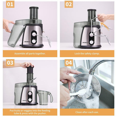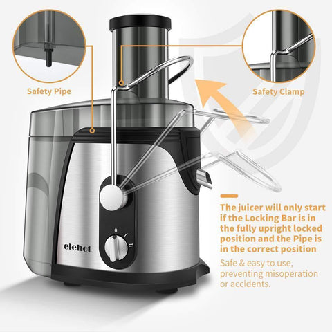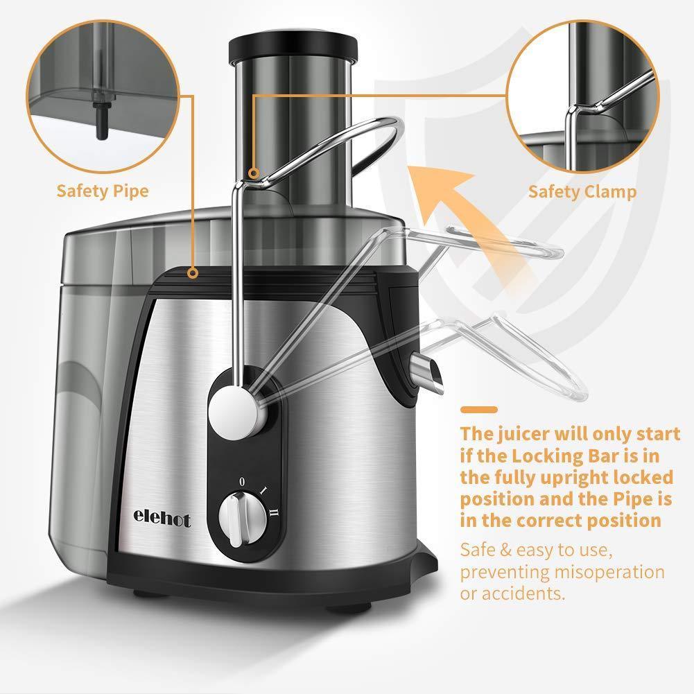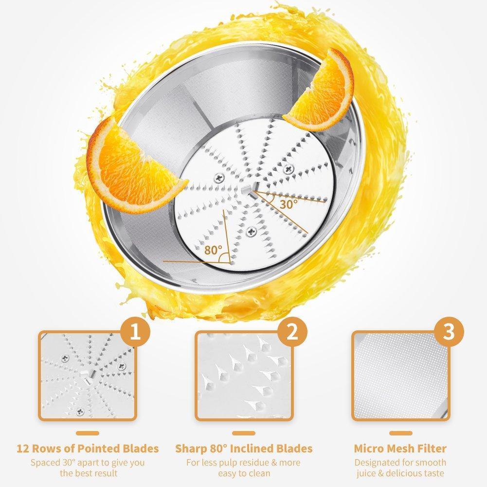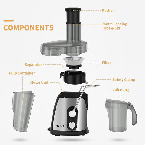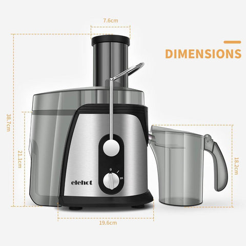 BPA Free Food Grade Stainless Steel Cutting Plate - Sharp 80°inclined blades bring less pulp residue, more easy to clean. ELEHOT juicer extracts up to 25% more juice and 30% more vitamins and minerals than other juicers. Enjoy a healthier & happier lifestyle all round!