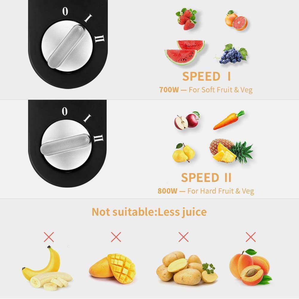 Dual-speed Modes for Fruit and Vegetable - "Ⅰ" low speed, 8000 RPM, for soft fruits like oranges, tomatoes and others; "Ⅱ" fast speed, 12000 RPM, for hard fruits like carrot, celery, beets, kale and others. Dual speed modes help extract the most juice from fruits&vegetables.
