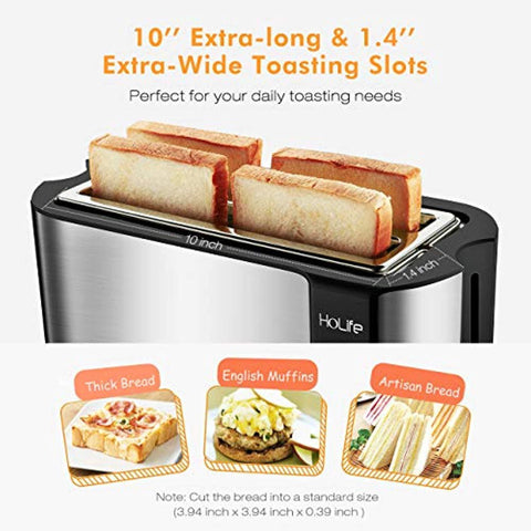 【Fast & Evenly Toast】Less time & money spent, 2 Extra wide 1.5” and long 10” slots to accommodate up to 4 slices of bread, or all shapes of specialty breads, which saves your time and gives you a perfect toasting experience; heating wire on both sides of each slot toasts breads evenly and fast.